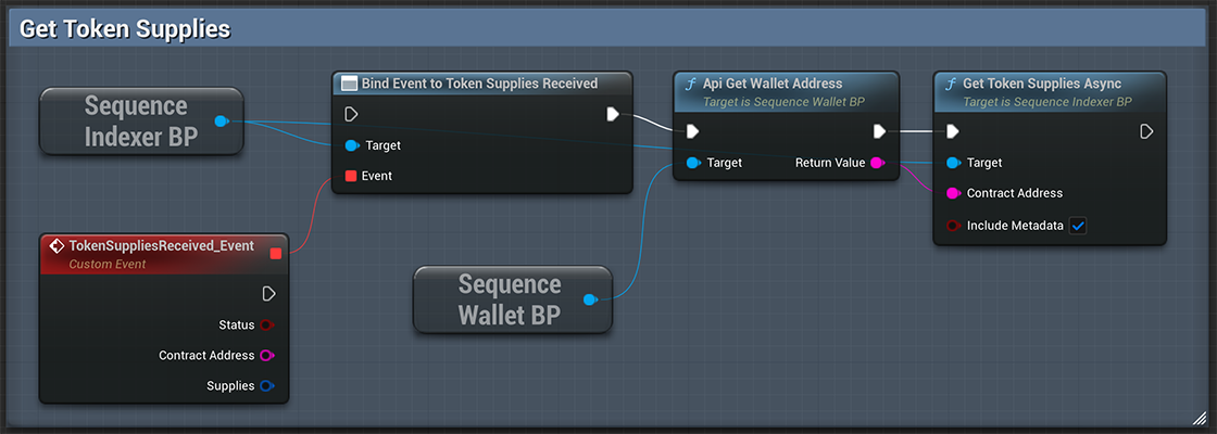 Contract Address (FString)An ERC20, ERC721 or ERC1155 contract address from which you want to retrieve token supplies.Include Metadata (Boolean)Enable this flag if you want to receive token metadata in the response.